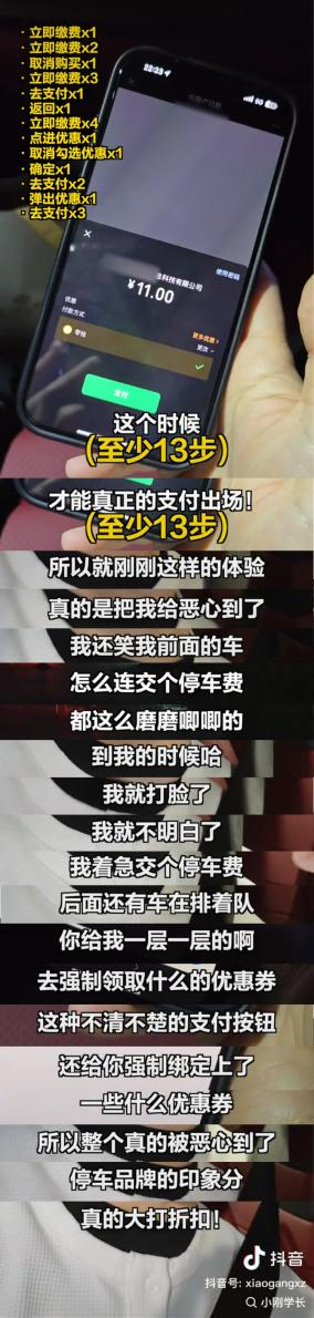 -     不少網(wǎng)友吐槽,自己在掃碼繳納停車費時體驗感不佳,明明輸入車牌號就可以付錢的小程序,卻還要和隨時彈出的廣告和所謂的“優(yōu)惠活動”斗智斗勇。網(wǎng)友A就曾有過這樣的經(jīng)歷:掃碼跳轉至繳費頁面,在“立即繳費x元”的下方,有一個白色框寫有“領取5元券本次停車可用”的字樣,點擊“確認”后,竟自動跳轉至廣告鏈接,上面提示,車主需要綁定支付寶并開通自動包月服務,才可領取到5元的停車抵用券。這樣一頓操作下來,全程下來需要花費大約5分鐘,且還不一定能成功領取抵用券。而網(wǎng)友B則是遇到過直接誘導消費的問題,停車兩小時,花費8元,但在繳費時出現(xiàn)了某某TV廣告鏈接,點進去后被扣了5元錢,工作人員告知費用是由第三方支付平臺扣除的,網(wǎng)友B只好吃了啞巴虧。類似以上這樣額外捆綁的行為頻頻發(fā)生,給用戶帶來了不必要的干擾和困擾。