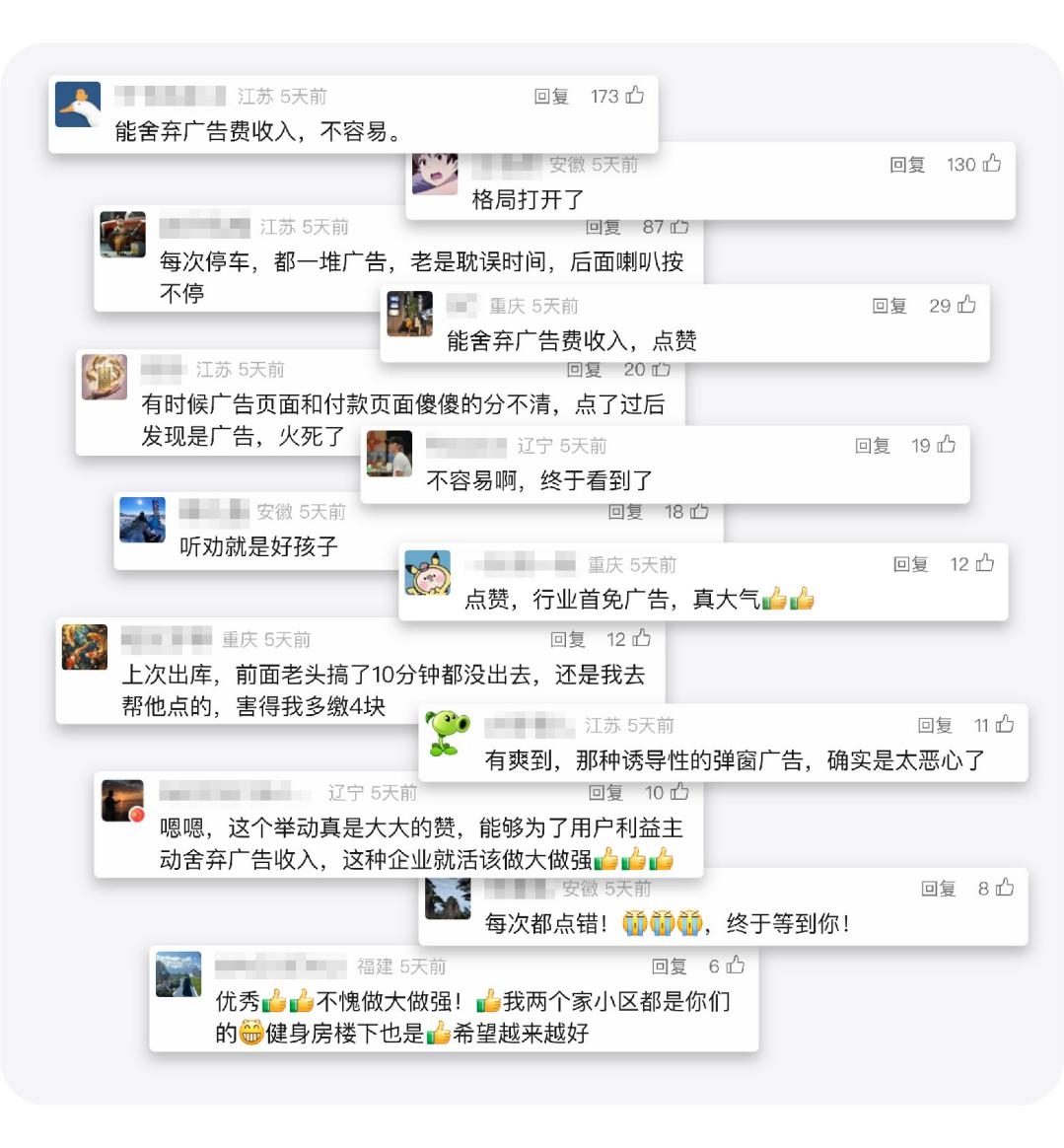 -     自速停車繳費純凈版上線以來,受到了眾多網(wǎng)友的贊揚與認可,“格局打開了”、“聽勸就是好孩子”、“能舍棄廣告收入不容易”、“行業(yè)首免廣告,大氣”......